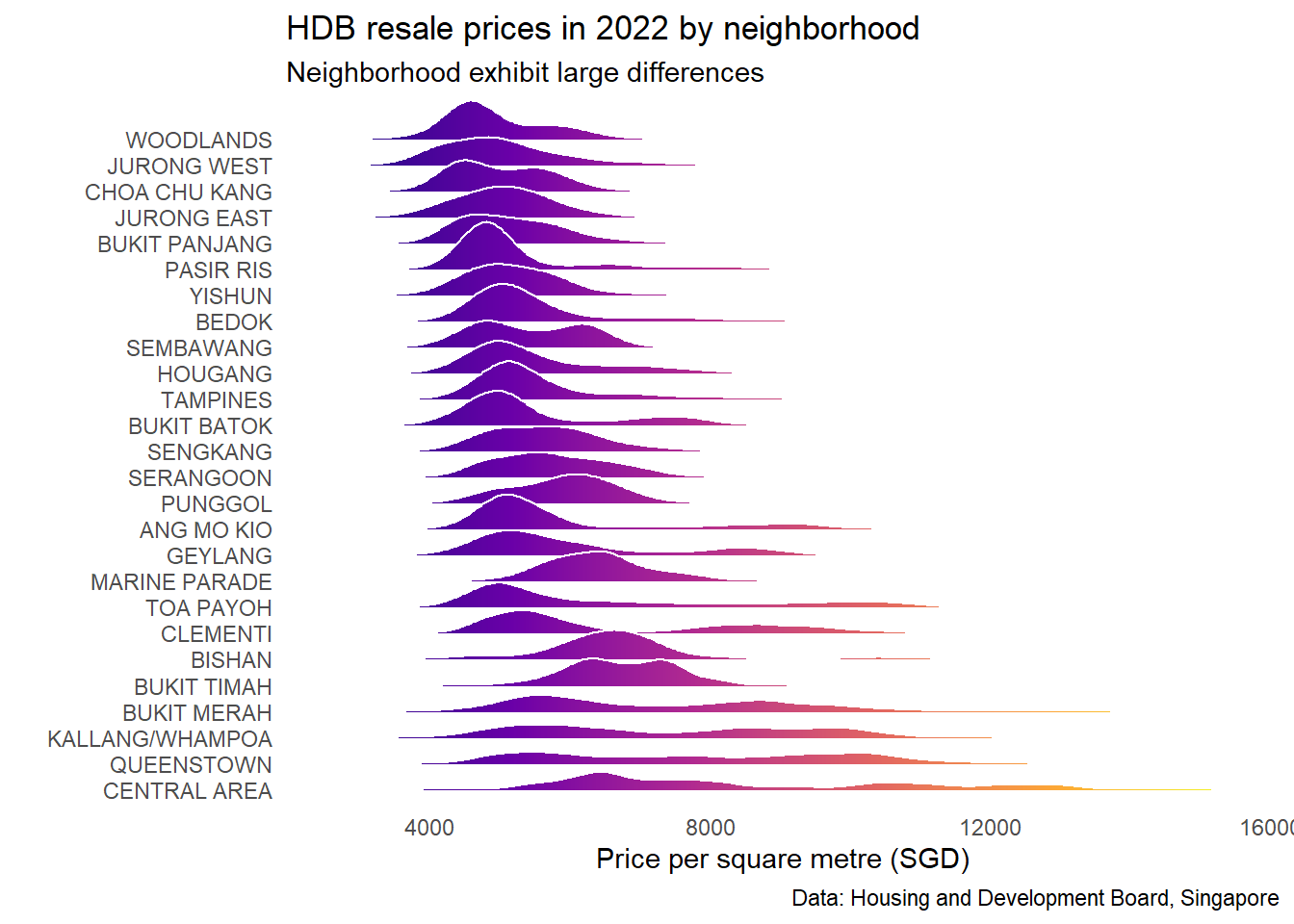 labs(title = "HDB resale prices in 2022 by neighborhood", x = "Price per square metre (SGD)", y = "",