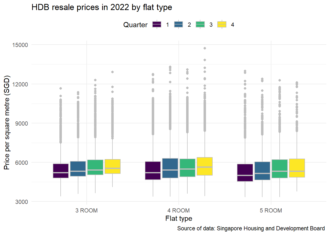 labs(title = "HDB resale prices in 2022 by flat type", y="Price per square metre (SGD)",